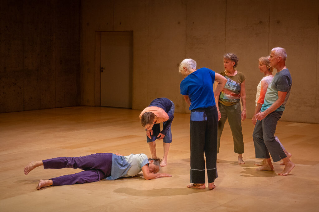 Das Kollektiv ‘dance me to the end’, aufgeladen durch vielfältige Lebens- und Tanzerfahrungen, eröffnet ein gemeinsames Spielfeld. Über das Aufspüren der physischen Ansätze von 27 Emotionen suchen 8 Tänzer:innen nach deren körperlichen und stimmlichen Manifestationen und tänzerischen Qualitäten. Es entsteht ein breites Spektrum an gefühlten, gespürten und atmosphärisch aufgeladenen, abstrahierten Körpersprachen, die durch das individuelle Vokabular entstehen und untereinander verhandelt werden. Verschiedenste Verknüpfungen, rasch wechselnde Energien und langatmige Transformationen formen sich zu einer vielspurigen Komposition, die sich in den Raum einschreibt. Eine Assoziationsbreite wird bewusst herausgefordert.